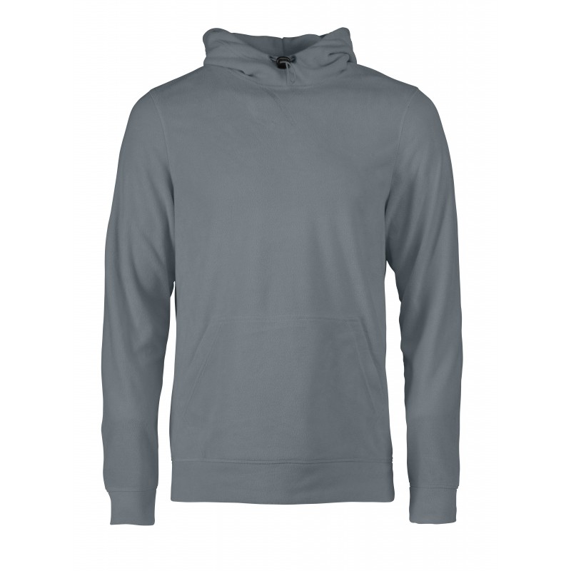 Microfleece hoodie sweater made in fabric to be active in. Front kangaroo pocket and elastic drawstring at hood.