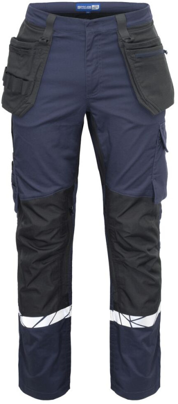 Spodnie robocze z otwartymi kieszeniami bocznymi oraz tylnymi o zwiększonej szerokości, lewa strona z klapą i magnetycznym zapięciem. Kieszenie na narzędzia po obu stronach, przeznaczone na narzędzia, długopisy itp. Kieszenie na nogawkach: po lewej stronie kieszeń z klapą i magnetycznym zamknięciem, wewnętrzna kieszonka na telefon oraz uchwyt na identyfikator. Po prawej stronie kieszeń na miarkę składana oraz kieszeń na narzędzia z guzikiem na nóż. Kieszenie na ochraniacze kolan, zewnętrzne otwarcie na zamek błyskawiczny. Szeroka szlufka z tyłu, zapobiegająca uciskowi pasa. Ukryty guzik z przodu. Profilowane kolana, elastyczna tkanina w kroku i wszyty pas elastyczny w talii dla zwiększonego komfortu. Wzmocnienia w kieszeni na miarkę, tylnych kieszeniach oraz na kolanach zapewniają większą trwałość.