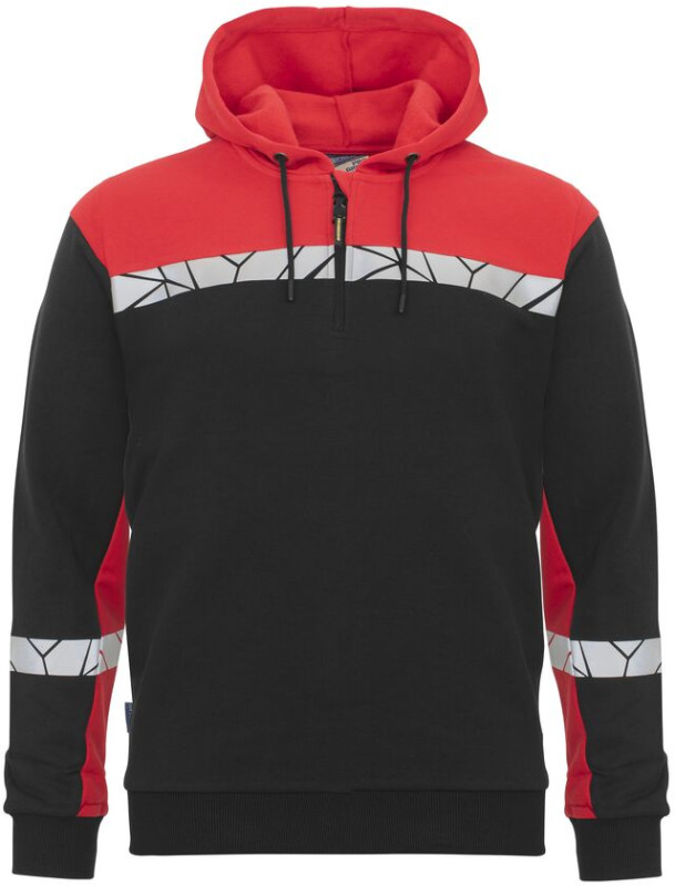 Bluza z kapturem i półzamkiem z przodu. Wnętrze wykończone drapaną tkaniną, zapewniającą przyjemne i miękkie odczucie. Otwarte kieszenie z przodu, z dodatkową kieszonką na zamek dla zwiększenia bezpieczeństwa. Kaptur z sznurkiem. Kontrastowa taśma przy dekolcie. 2x2 ściągacze przy mankietach i na dole bluzy. Kieszonka na metkę w wewnętrznej lewej szwie.