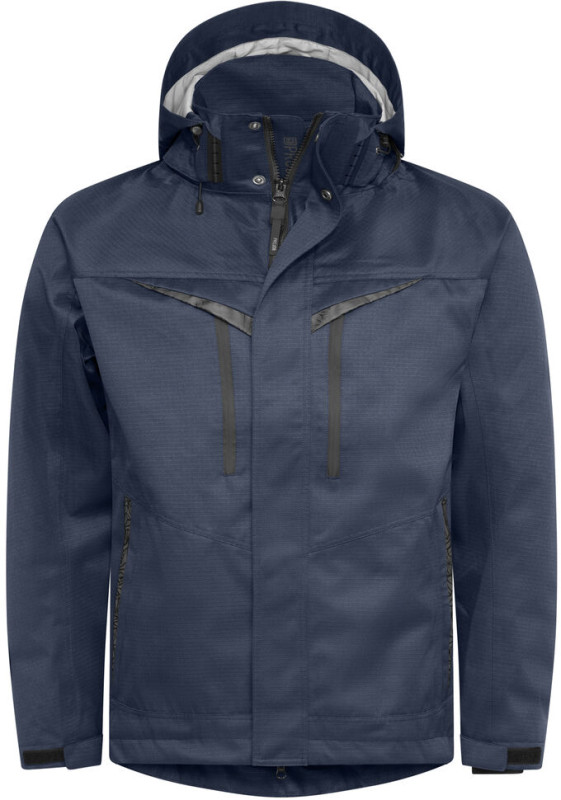 Wiatro- i wodoodporna kurtka typu shell z podklejonymi szwami, wykonana z materiału rip-stop. Zamek błyskawiczny dwukierunkowy z przodu, osłonięty patką, aby zapobiec przedostawaniu się wiatru i wody, zapinany na napy. Kieszenie na piersi po obu stronach z zamkiem, w lewej kieszeni wewnętrzny uchwyt na identyfikator. Kieszenie boczne z zamkiem. Wewnętrzne kieszenie po obu stronach z zamkiem, po lewej stronie jedna otwarta kieszeń zapinana na rzep. Odpinany kaptur, regulowany w dwóch płaszczyznach za pomocą troczka. Regulowane mankiety na rzep, dodatkowo wewnętrzny uchwyt na kciuk. Regulowany dół kurtki za pomocą troczka. Podszewka może zostać otwarta, aby ułatwić nadruk.